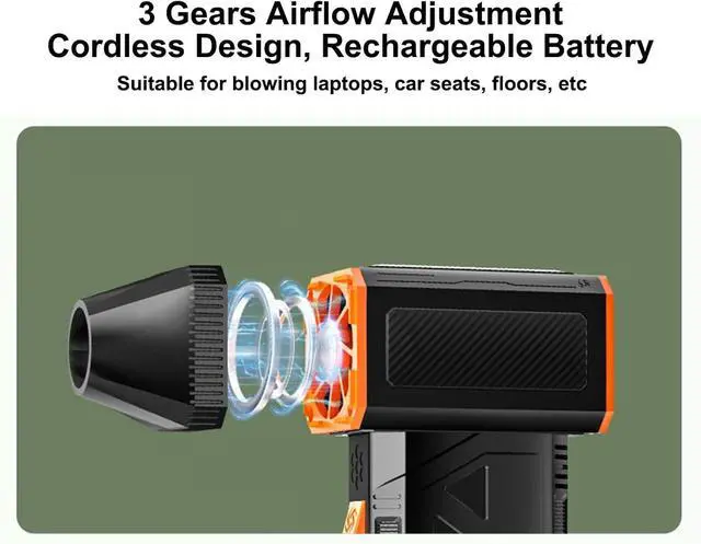 [3 GEARS AND BATTERY POWERED] With 3 gears airflow adjustment and built-in 2 x 2500mAh batteries, this cordless air blower offers versatility and convenience. It supports 10W fast charging to meet various needs.