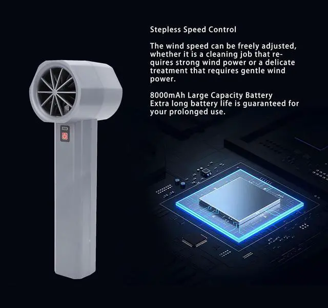 Large Battery Capacity: The compressed air duster features an impressive 8000mAh large capacity battery, providing extended runtime for prolonged usage. This allows you to work for extended periods without frequent recharging, ensuring uninterrupted operating and maximum efficiency.