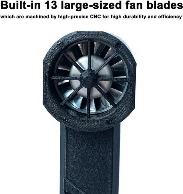 [Silent & Efficient operate] Equipped with a 28.8mm low-voltage brushless high-speed motor, this fan operates at just 8.4v, providing silent yet strong wind performance. the built-in 13 large-sized fan blades are precision-machined for high durability and efficiency, ensuring smooth and consistent airflow.