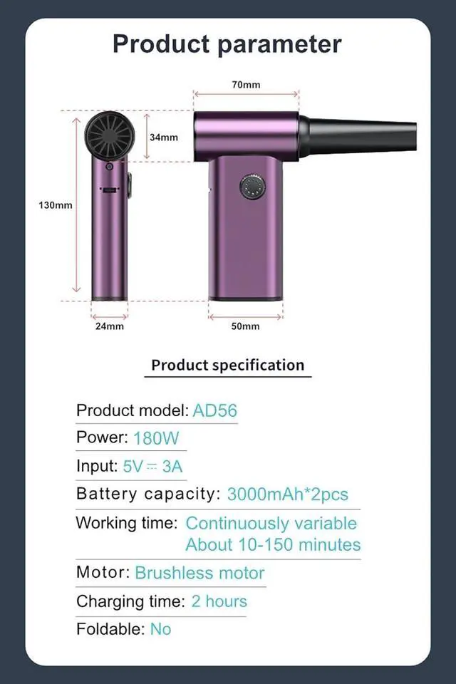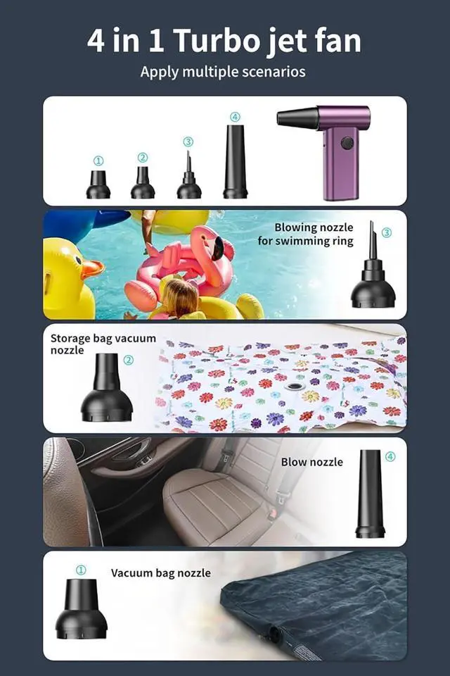 2-In-1 Blower and Vacuum Cleaner: The air vacuum cleaner has a variety of nozzles, brushes, and vacuum cups, suitable for dust removal or vacuum cleaning in various scenarios, such as computers, fans, lily windows, keyboards, cars, and home cleaning wait.
