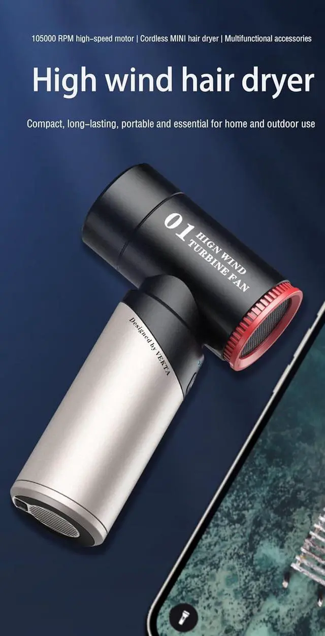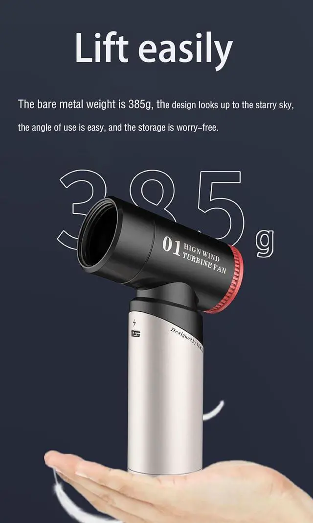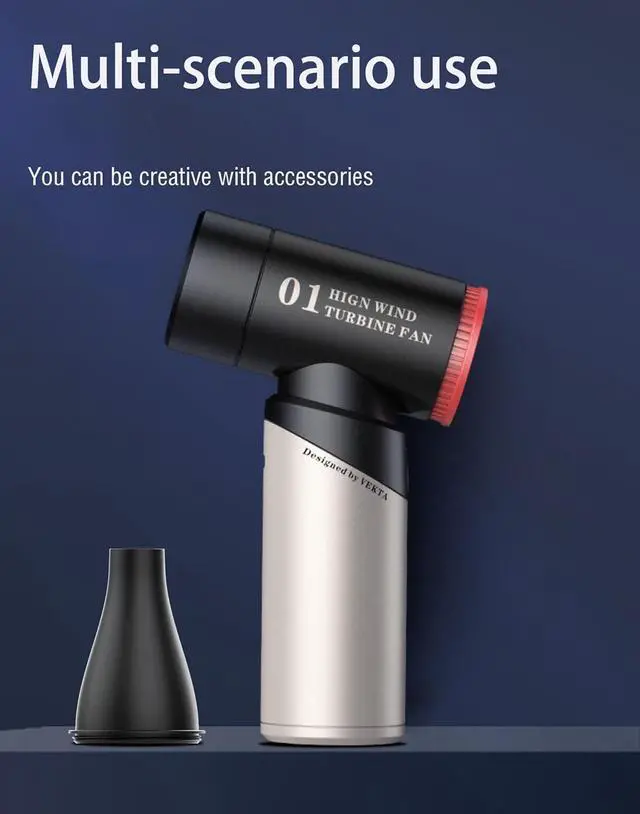 Magnetic nozzle and energy-saving operation - This mini turbojet fan is equipped with a magnetic nozzle for precise control of airflow, which can effectively eliminate dust and dirt, leaving the surface spotless. Its overheating protection and cooling vents extend lifespan, while USB Type-C fast charging offers convenience and energy savings.