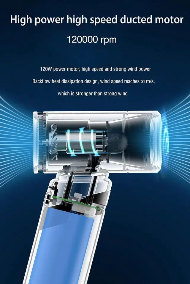 Fast wind speed: The ultra-mini jet fan rotates at a speed of up to 120,000RPM, producing a powerful blowing force of up to 32m/s. This compressed air duster is powerful and effective, easily removing 99% of dust and debris from any surface.