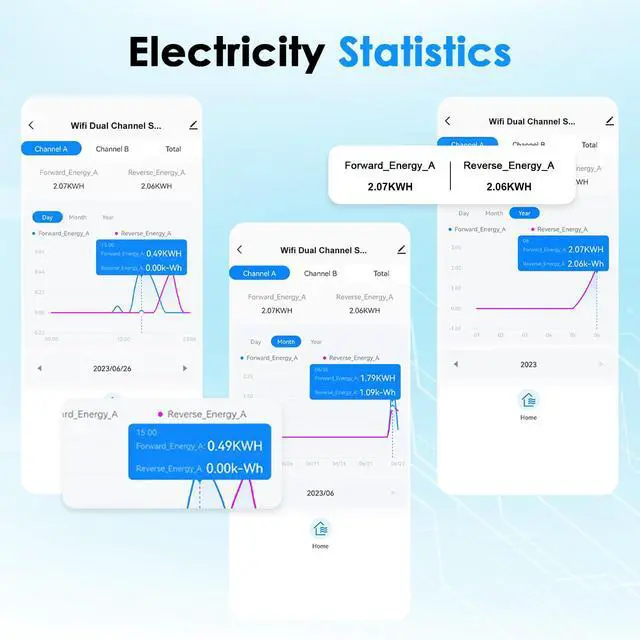 Bi-Directional Energy TrackingThis smart home energy monitor supports bi-directional power monitoring, allowing you to view electricity flow based on direction. It helps track energy usage in homes with solar panels, backup power systems, or mixed load scenarios, providing clearer insight into both power consumption and energy flow.