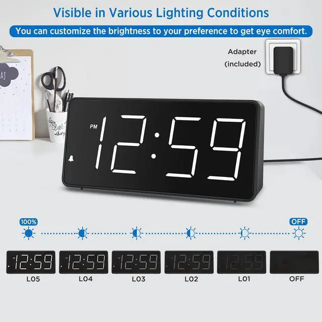 5 different brightness settings ensure clock time is always visible in various lighting conditions. You can customize the brightness to your preference to get eye comfort and improve sleep by adjusting the display to a lower brightness level or completely off at night.