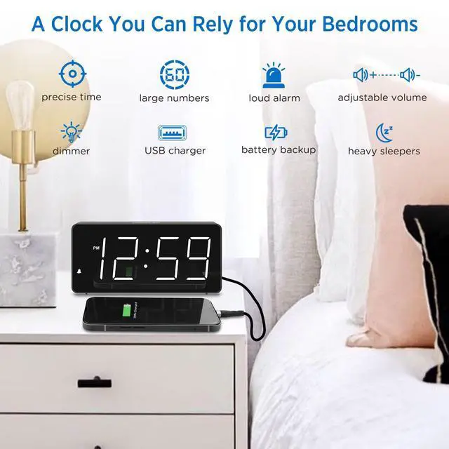 [Peakeep] gathers all features you rely on a clock for your bedroom, such as precise and clearly visible numbers, a loud alarm with snooze and volume control, adjustable display brightness, 1 USB charger, and even a backup battery alarm in case of power outages.