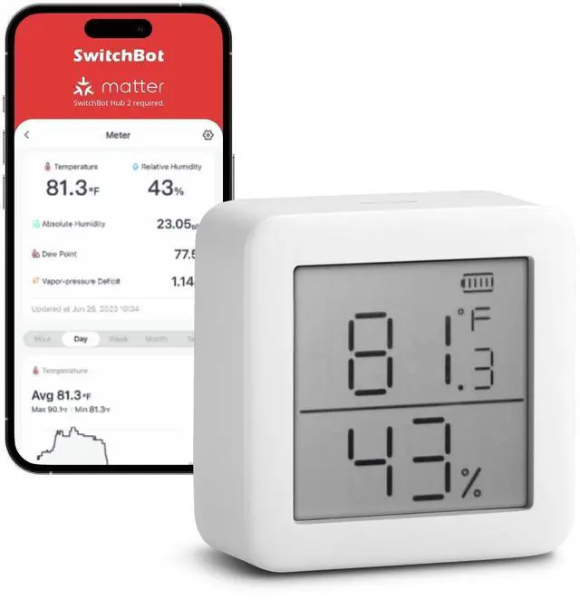SwitchBot Thermometer and Hygrometer (the Meter) monitors and tracks your home temperature and humidity easily. If you have any concerns during use, please kindly report issues via the Feedback in your Profile of the SwitchBot App. (The package contains a thermometer hygrometer and two batteries.)
