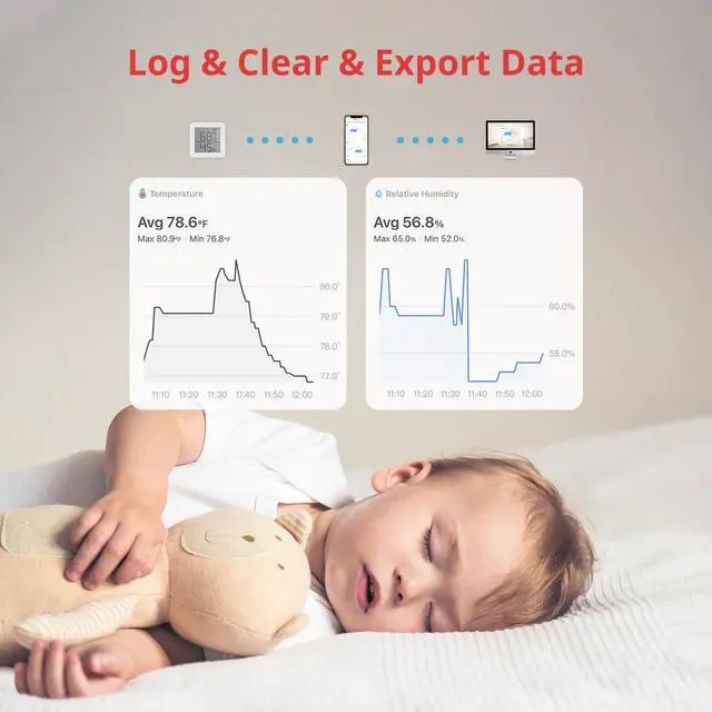 Thanks to 36 days of on-board storage and 2 years of In-App storage (Unlimited cloud storage when SwitchBot Hub is added), you can view and export temperature, humidity, absolute humidity, dew point, and VPD data through the App.
