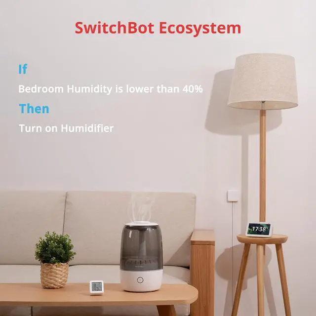 - When a temperature or humidity condition is met, turn on your air conditioner and SwitchBot Smart Humidifier.