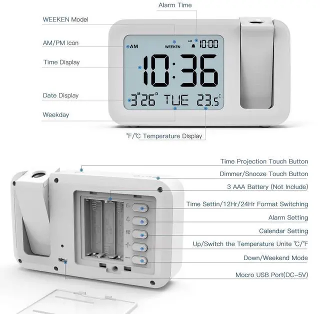 With separate buttons(On the back of the Projection Clock), the projection alarm clock is designed with simplicity for kids or seniors.
