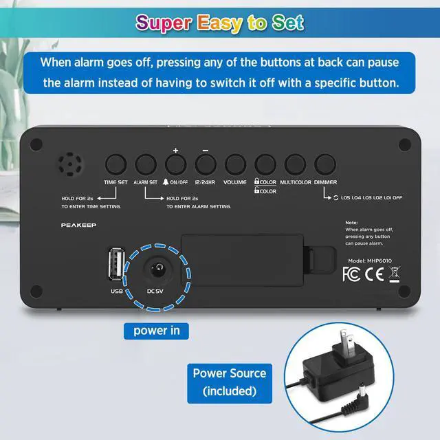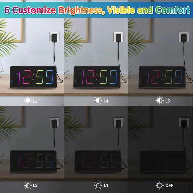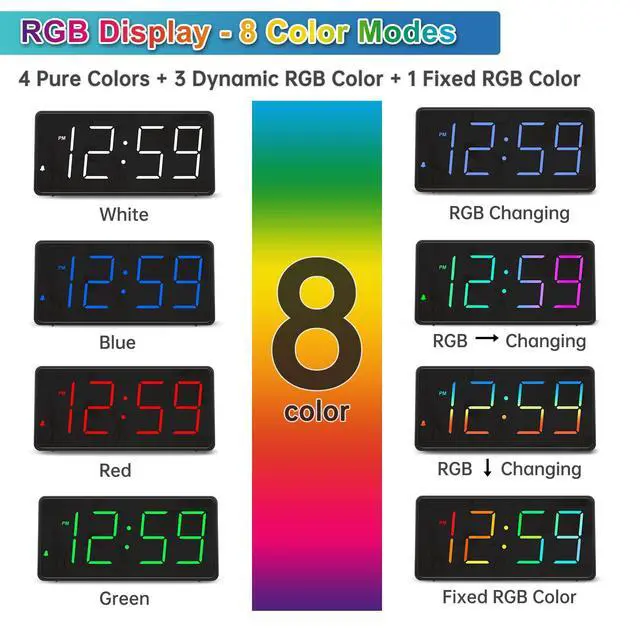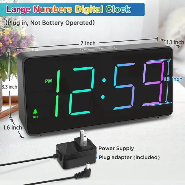 : Peakeep gathers all features you rely on a clock for your bedroom, such as precise and clearly visible numbers, a loud alarm with snooze and volume control, adjustable display brightness, 1 USB charger, multi-colors available and even a backup battery alarm in case of power outages. : This large 7(L) * 3.2H* 1.5 (W) inches digital clock features 1.8 inches height of RGB colorful display, therere 8 color modes including 4 pure colors of white blue red green and 3 color changing dynamic colors and 1 fixed rainbow color display, providing a clear and easy way to keep track of time across your room. : 5 settings of volume control enable the alarm from 65 Db, 75 Db, 85 Db, 95 Db, 105 Db, it can be loud for heavy sleepers. It also allows light sleepers to set the alarm at a low volume. 9-min snooze can be helpful if you like to catch a few extra minutes of sleep in the morning. : 5 different brightness settings ensure clock time is always visible in various lighting conditions. You can customize the brightness to your preference to get eye comfort and improve sleep by adjusting the display to a lower brightness level or completely off at night. : With the power source AC/DC adapter included, Peakeep digital LED clock is able to run smoothly and accurately, an absolute must for anyone who values punctuality and reliability. 2 AAA batteries (not provided) can memorize clock settings and trigger the alarm when power outages, you wont oversleep or worry about resetting the time. : . : The clock can charge your phone or other devices while you sleep, this can be convenient and save you some space on your nightstand. : When alarm goes off, pressing any of the buttons at back can pause the alarm and reset it for the next day instead of having to switch it off with a specific button.