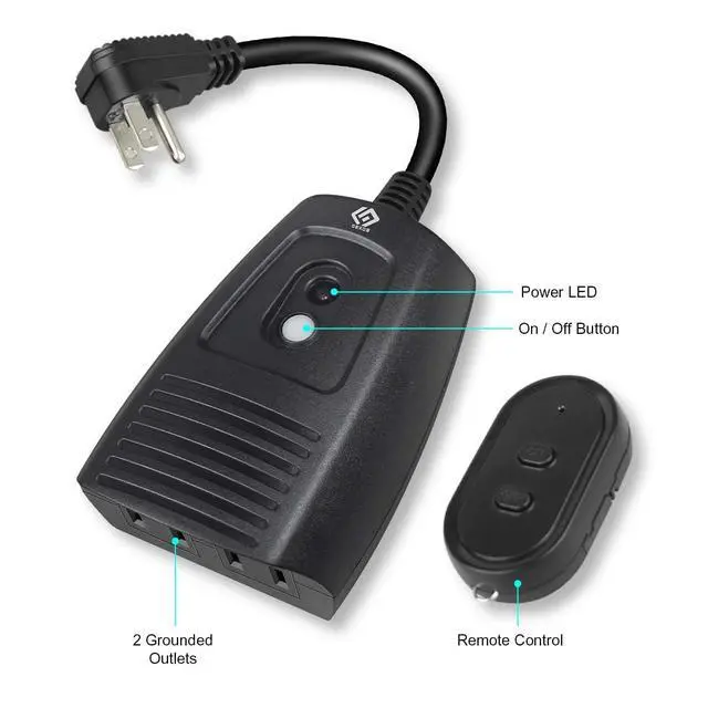 [Easy to Use] This remote outlet comes pre-paired with the remote control (battery included). Simply press the ON/OFF button to remotely control hard-to-reach sockets, yard lighting, holiday decorations, and more [100 Feet RF Range] Strong RF signal works through walls and doors without interference; operates up to 100 feet(30meters) in open areas. [Rugged and Weatherproof] The housing is constructed from materials designed to resist damage from sunlight, rain, and dust [Versatile Usage] Compatible with various appliances, supporting up to 15A at 125V, suitable for a 1000W tungsten load and a 1/2 HP loads [Safe & Reliable] UL certified with grounded outlets for added safety