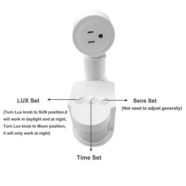 Lux Button adjustment can adjust the light to work all day or only at night, Turn LUX knob to SUN position, it will work in daylight and at night, Turn LUX knob to Moon position,it will only work at night.