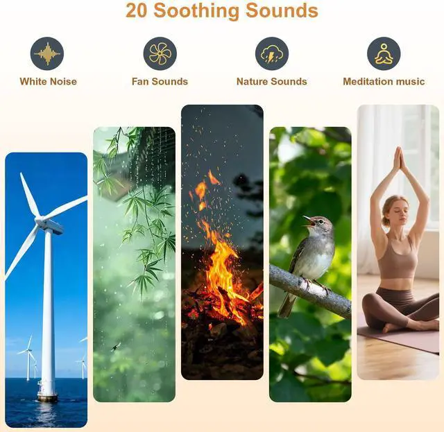 Relaxing Sounds & Timer for Insomnia Relief/Yoga/Meditation/Focus/Noise CancellingA perfect sleep aid device creates ambiance with White/Brown/Pink Noise/Birds/Fans/Rains/Fire/Ocean/Thunderstorm/Wind 20 soothing sounds. 12 volume levels. Auto-off timer (30/60/90/120 min) sound & light turn off automatically