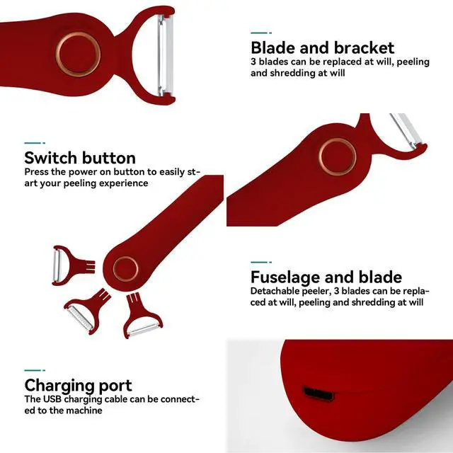 • Easy to use Our electric potato peeler is very simple to use, just press the power button then you can peel almost all fruits and vegetables in seconds quickly and effectively, it saves your time and effort. 3 extra stainless steel sharp blades, easy to change and save your space. One-edge peeler used for peeling fruit and vegetable potato skin; Y-shaped peeler tend to peel fruits and vegetables in two-way; Julienne peeler will make julienne strips from vegetables, such as carrot.