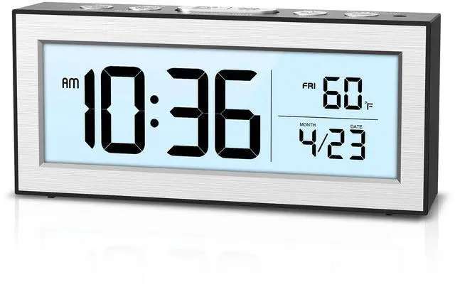 HD Display Battery Alarm Clock Large HD screen shows time, date, weekday & temp—perfect battery powered alarm clock for bedroom or desk.