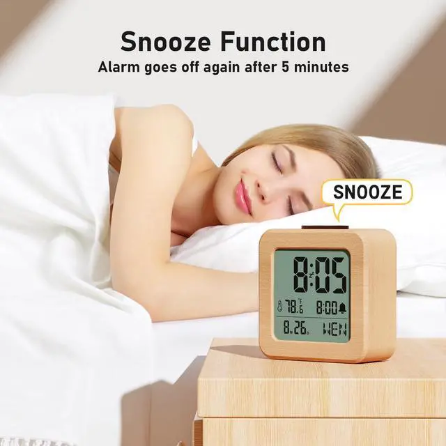 2119, 2119-1, Digital, Wood, Tabletop, Battery Powered, true, 3.74 L x 1.5 W x 3.68 H inches, Loud Alarm, Snooze, Temperature Display, Day Mode, Battery Indicator, CHEREEKI