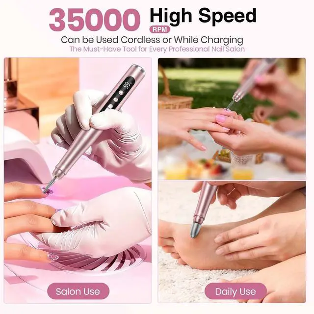 Cordless Nail Drill 35000RPM, Portable Electric Nail File for Acrylic Gel Nails, Professional Manicure Pedicure Kit, Rechargeable Pedicure Tools for feet with LCD Display, Low Noise Low Vibration