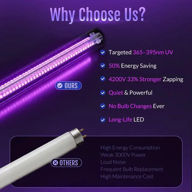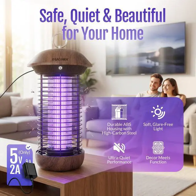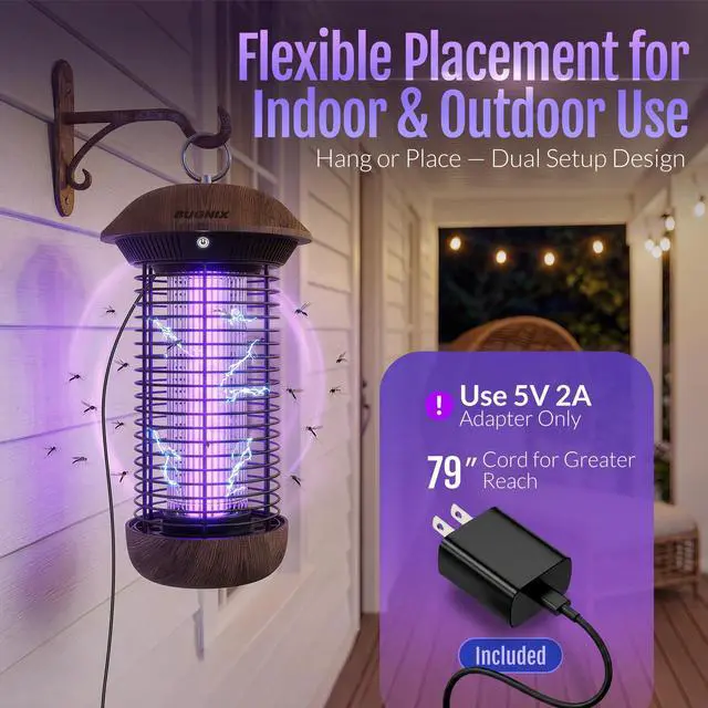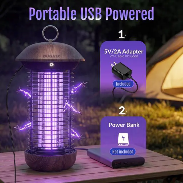 Upgraded 365395nm Attraction & Portable USB Powered: This electric bug zapper uses a 365395nm UV bug light to attract insects and a powerful 4200V grid to eliminate them instantly. No sprays or chemicalssafe for family and pets. Energy-efficient UV-LED uses 50% less power than fluorescent lamps. Supports both 5V/2A adapter(included) and power bank(not included) use for indoor or outdoor convenience. Important: This device requires continuous plug-in power and is not battery-operated.