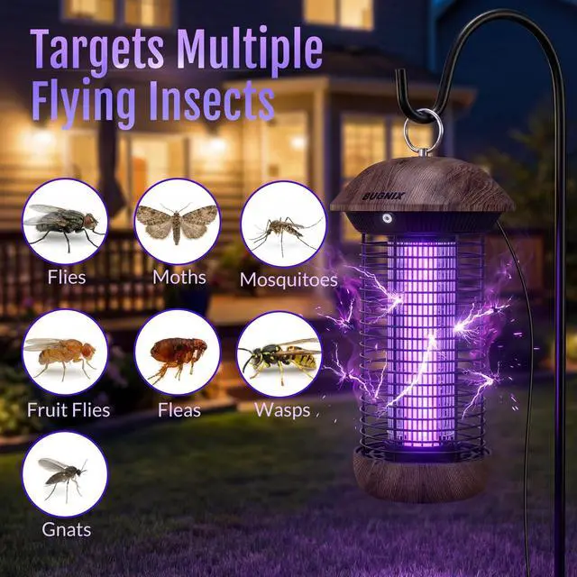 Wide Coverage for Indoor & Outdoor Spaces: Designed as a versatile bug zapper indoor and outdoor, it includes a 2 m power cord and a metal hanging ring for flexible placement. Ideal for bedrooms, living rooms, kitchens, patios, garages, restaurants, camping sites, and more. This fly zapper and mosquito trap attracts mosquitoes, gnats, moths, fruit flies, wasps, and other flying insects. Tip: Place the device around 6 m / 20 ft away from people for optimal protection and to reduce bites nearby.