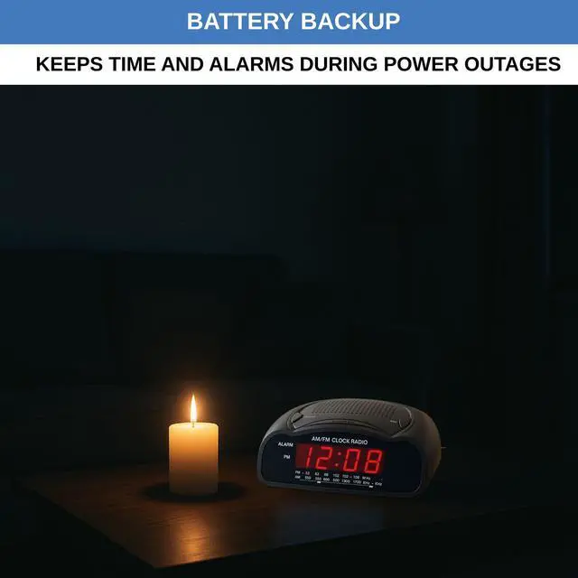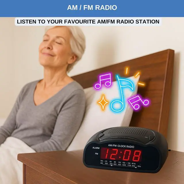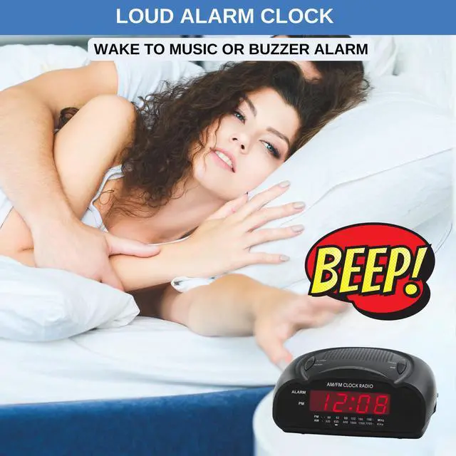 Loud Alarm with Buzzer or Radio: Designed for heavy sleepers, this clock lets you choose between a loud buzzer or your preferred AM/FM radio station. Easy-to-use buttons let you set alarms fast, with reliable wake-up performance every time. Clear Red LED Display: Large, bright red digits are easy to read day or night. See the time clearly from across the room, even in the dark. A simple, effective display with no glare or eye strain. Simple and Easy to Use: All controls are clearly labeled for quick setup. Whether setting the time, choosing alarm mode, or switching to radio, this alarm clock is built for hassle-free use by anyoneno tech skills required. Compact Clock: This space-saving alarm clock fits on any nightstand or desk. Ideal for bedrooms, dorm rooms, offices, and guest spaces.