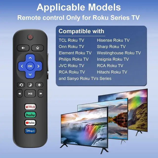 Applicable Models: Remote control Only for Roku TV Compatible with TCL Roku TV Onn Roku TV Hisense Roku TV Sharp Roku TV Element Roku TV Westinghouse Roku TV Philips Roku TV Insignia Roku TV JVC Roku TV RCA Roku TV Hitachi Roku TV and Sanyo Roku TVs Series.