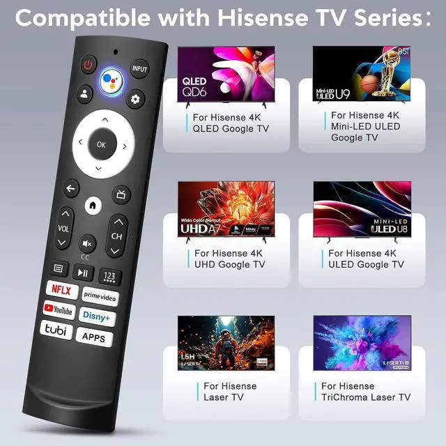 Applicable TV TypesVoice Remote ERF3M90H compatible with Hisense-Smart-Google-TV including 4K Mini-LED / ULED / QLED / Laser / TriChroma Laser TV.