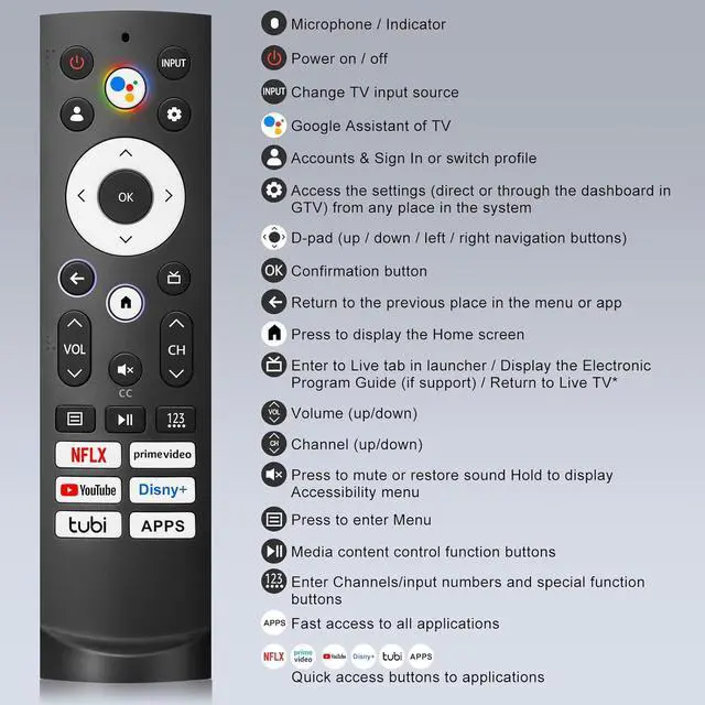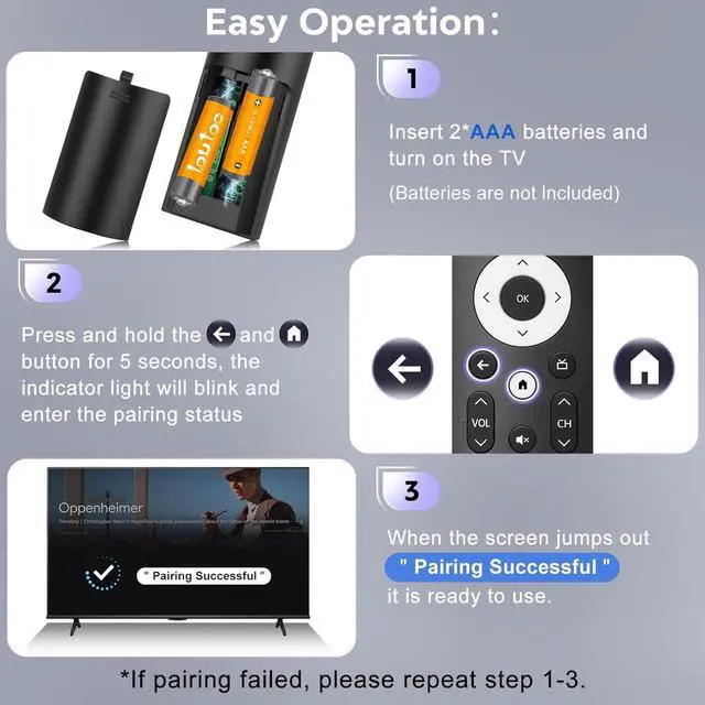 AccessDedicated streaming hotkeys: Netflx Primvideo YouTube Disny+ tubi and APPS. Equipped with a built-in high-sensitivity microphone and voice connectivity the remote control delivers seamless voice-activated search capabilities. Easy Pairing1) Insert 2*AAA batteries and turn on the TV. 2) Press and hold the Back and Home button for 5 seconds the indicator light will blink and enter the pairing status. 3) When the screen jumps out Pairing Successful it is ready to use.