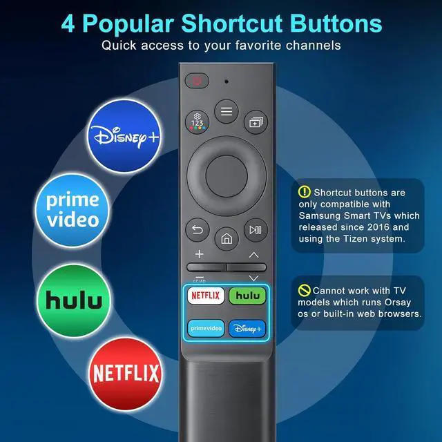 Key FeaturesThe remote control is designed with Netflix P-Video hulu and Disney streaming buttons one key access to your favorite channel. It features with up to 40ft long range transmitting distance and 0.2 s fast response. Streaming buttons Compatible For 2022 and 2023 Samsung TV Model series. The Disney+ is compatible with most Samsung Smart TVs released since 2016 and using the Tizen system. But it does not work on models running Orsay os or built-in web browsers. No Programming No Pairing Needed Work out of the box without any settings just insert 2*AAA batteries and it worked immediately.