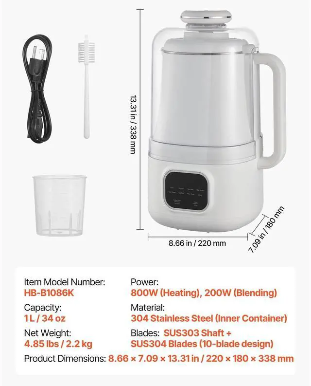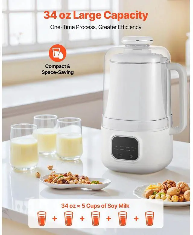 Generous Capacity: With a 34 oz capacity, this nut milk maker is designed to cater to family-sized servings in a single use, offering convenience and efficiency. Use it to blend fruits, vegetables, and grains into a variety of nutritious and delicious beverages.