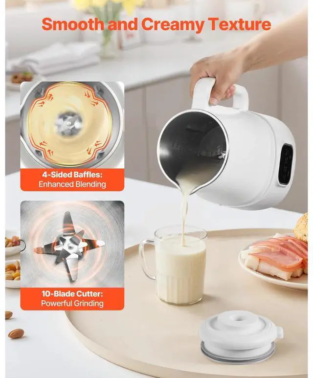 Refined Consistency: Equipped with 10 stainless steel blades, this soy milk maker efficiently processes nuts, seeds, and grains into velvety, creamy beverages. Its 4-sided turbulence structure ensures exceptionally fine blending, eliminating the need for straining.