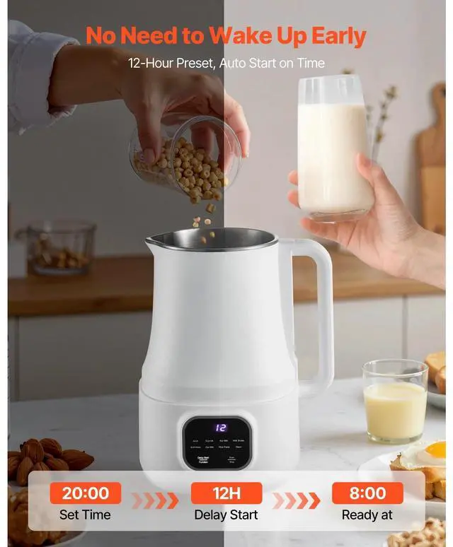 Effortless Use: This multifunctional nut milk machine offers 8 distinct features, including soy milk, nut milk, oat milk, fruit and vegetable beverages, rice paste, smoothies, hot water, and high-temperature cleaning. Operate with a single touch or switch, and enjoy the convenience of a 12-hour preset for freshly prepared drinks in the morning.