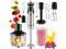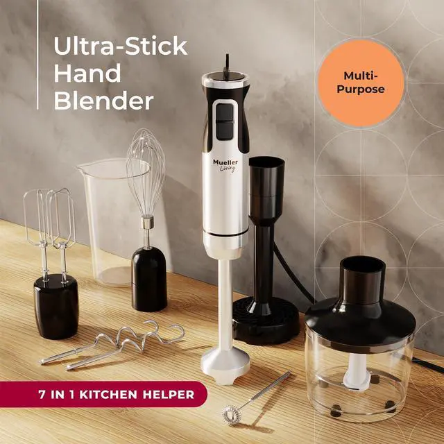 7 Easy Attachments Stick blender with: (1) Stainless Steel Blending Shaft to blend shakes, soup, veggie purées (2) Frother for foaming all milk types; (3) Whisk for whipping cream or batter; (4) Mixing hooks for all type of doughs; (5) Beaters to make your pancake or waffle batter; (6) Chopper to quickly chop your favorite ingredients; (7) Potato masher to make creamy mash potatoes or mash other veggies and fruits