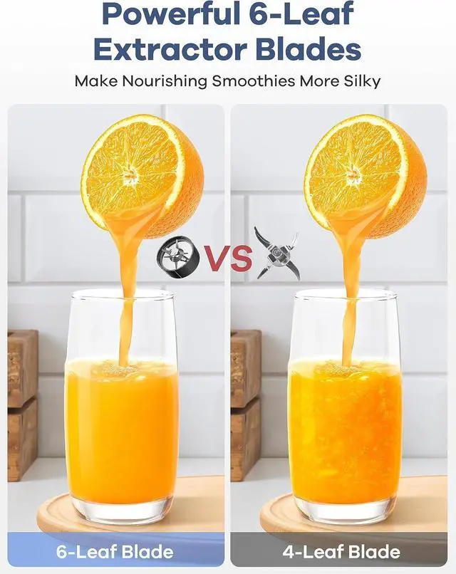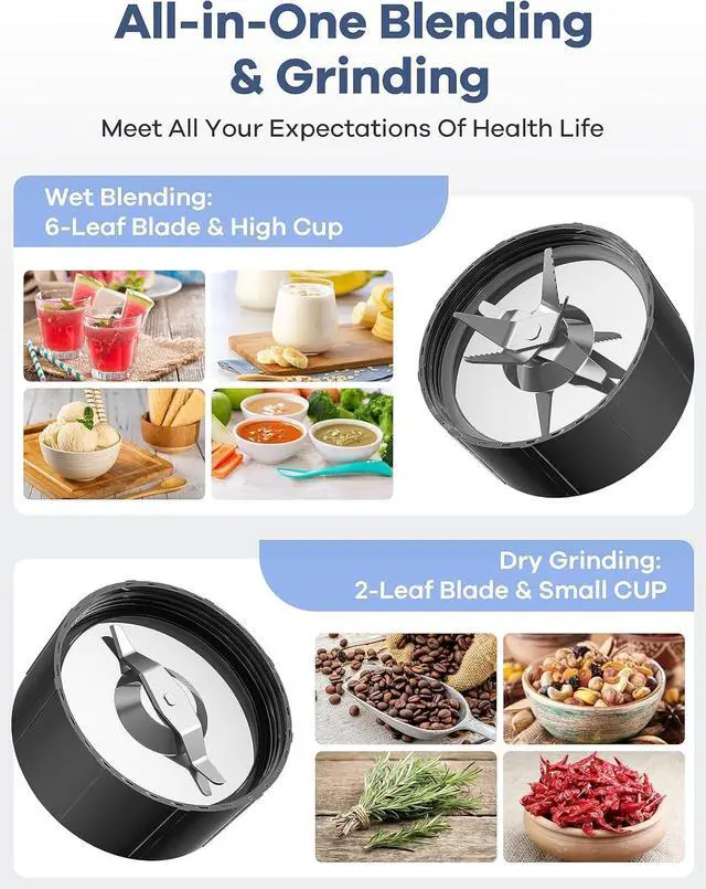 Multi-Function BlendersYour personal blender comes with a stainless steel 6-blades, make it easy to blend various hardness of ingredients, even crushing ice. Great for blending smoothies, juices, milkshakes, sauces, jams, baby food. A powerful string flat blades use cyclonic action to break down tough ingredients, great for grinding like coffee beans, spices.