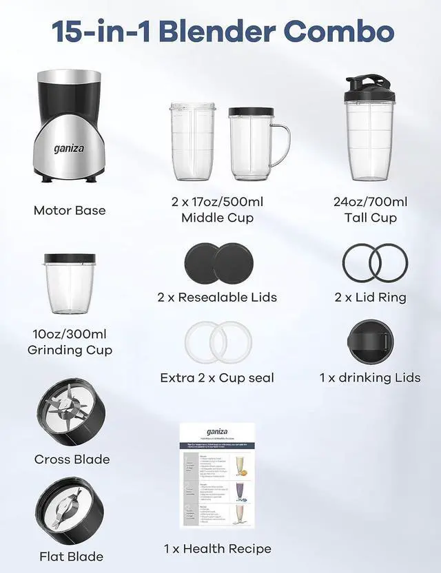 15-in-1 Countertop Blender and Grinder Combo (1) Peak Power 900W motor base, (1) 6--blade cross, (1) 2-blade flat, (1) 24 oz. portable Cup, (2) 17 oz. Middle Cup, (1) 10 oz. grinding Cup, (1) to-go lid, (2) lip ring, (2) resealable Lids, (2) Cup Sealing Ring, (1) Recipe.