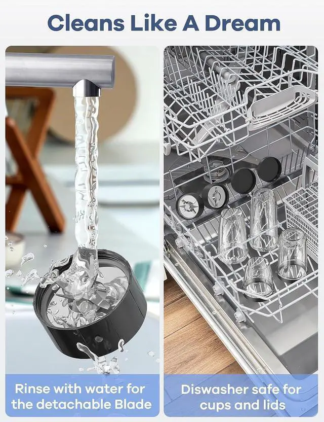 Cleaning FriendlyCleaning is a breeze just add soap and warm water, and the blender will start its self after properly locked into the base. In addition, the smoothie maker can be easily cleaned in a dishwasher, except for the motor part (The Main Body).