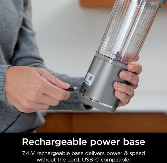 WHATS INCLUDED: 7.4V USB-C rechargeable motor base with (1) Blade Cover, (2) 18 oz. Blending Vessels with (1) Vessel Cap, (2) Easy-Open Sip Lids with carrying handle, USB-C Cable, Quick Start Guide