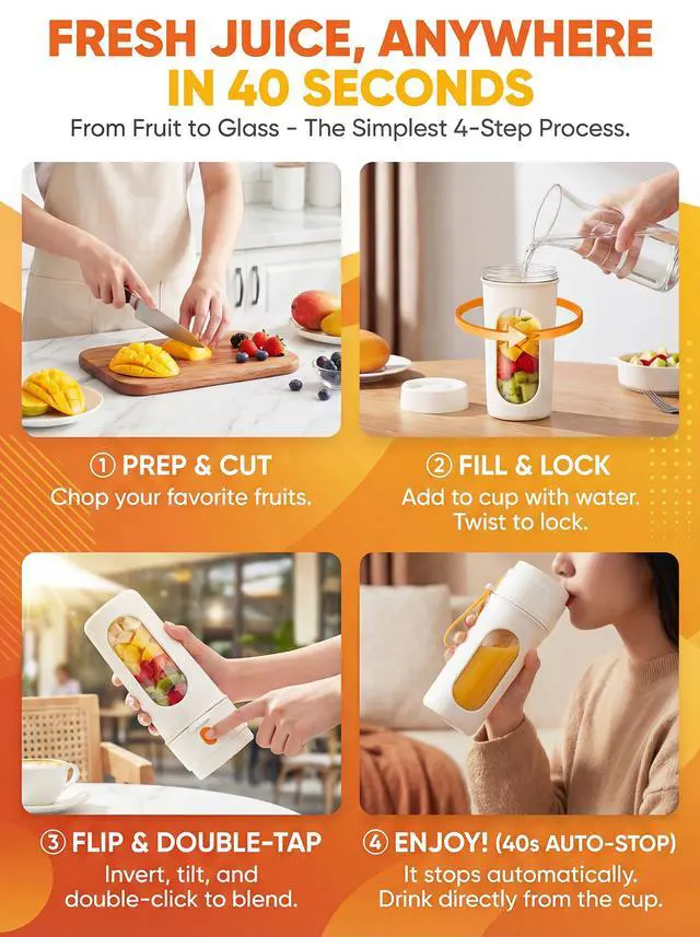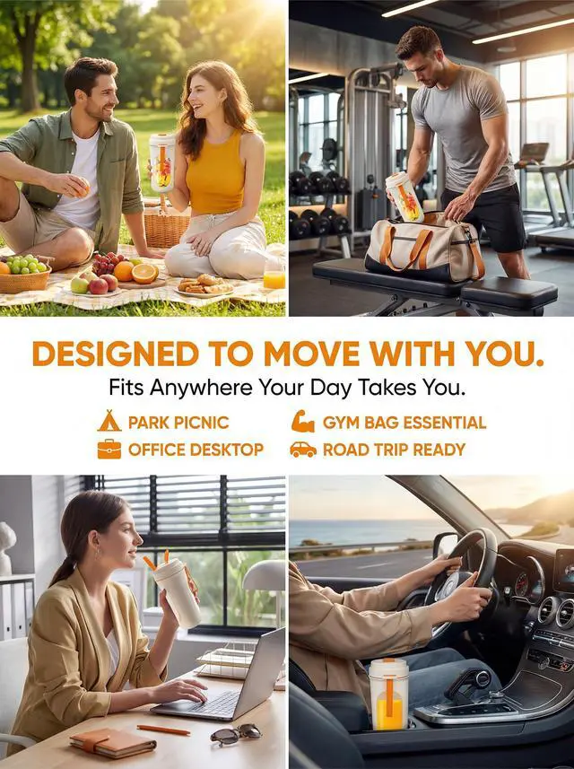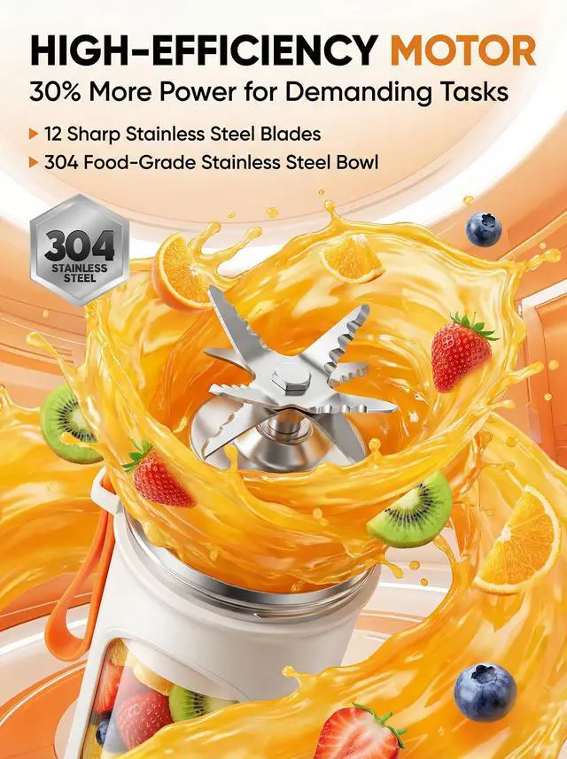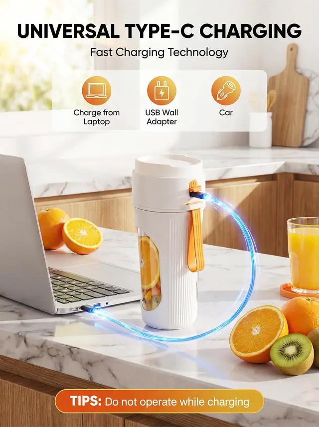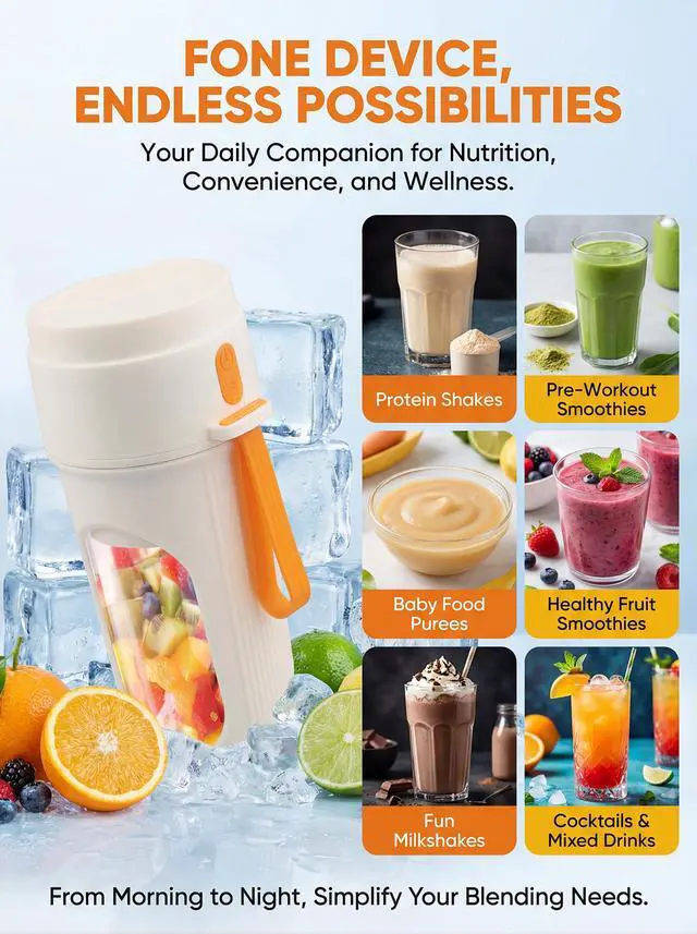 Make fresh smoothies anywhere with this portable mini blender. Its 12-blade system whips fruit and soft ice into silky drinks in seconds, while the 15oz BPA-free sport bottle lets you blend and sip from the same cup. The USB-C rechargeable design keeps you powered at the gym, office, or on trips without hunting for outlets. A slim, compact body slides into backpacks and car cup holders, and the secure travel lid prevents leaks in your bag. When youre finished, the removable bottle and blade assembly are dishwasher-safe for effortless cleanup. Ideal for smoothies, shakes, protein drinks, baby food, and quick refreshments wherever life takes you.