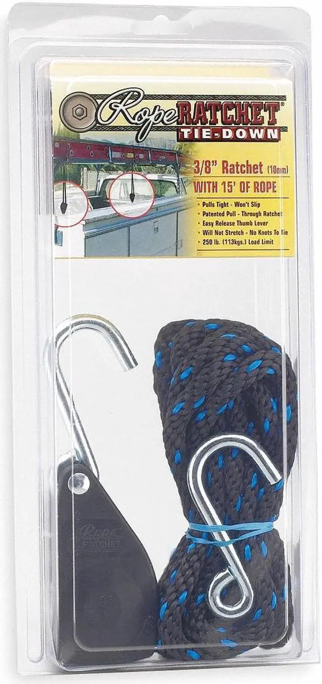 Rope Tie Down, Color Black, End Type S-Hook, Includes Ratchet, Rope, Rope Length 15 ft, Product Type Rope Tie Down, Rope Diameter 3/8 in, Rope Material Polypropylene, Working Load Limit 250 lb, End Material Steel. This item has been restricted from sale in the following state (s): []