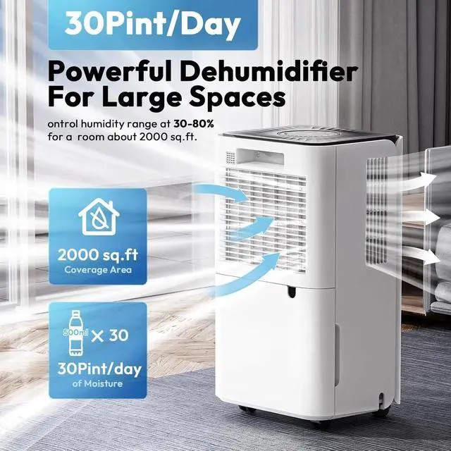 Powerful Dehumidifier for Basement: LUKO dehumidifier can reduce up to 30 pints of moisture per day (95°F 90%RH), and cover room areas up to 2000 square feet (Maximum). This energy-saving dehumidifier endowed with 180m³/H air circulation and it can efficiently remove excess moisture from the air, reduce dampness, and better protect walls and furniture, which are suitable for large rooms such as bedrooms, bathrooms, Basements, living rooms, hallways, kitchens, cellars, garages, etc.