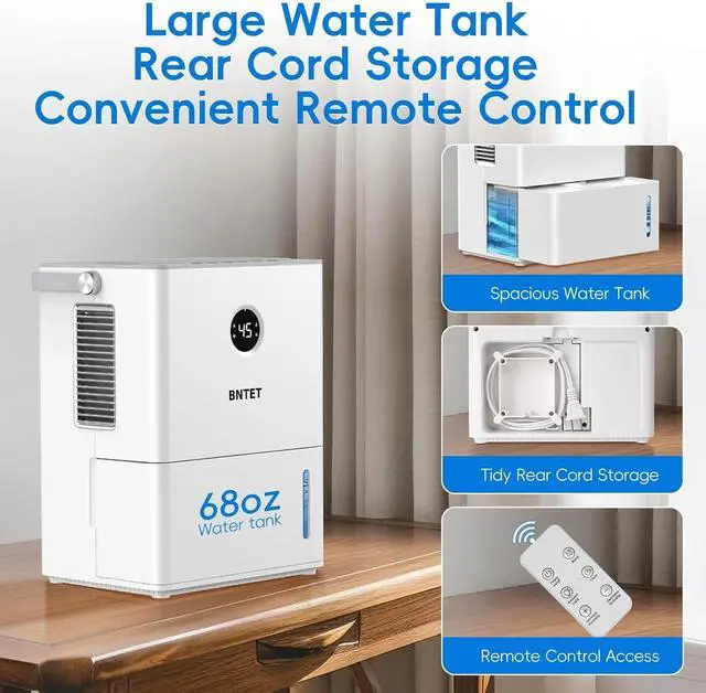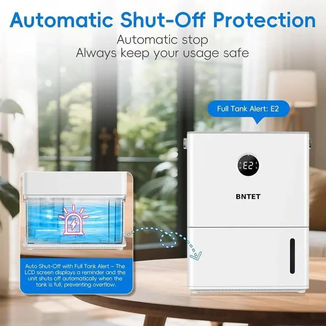 - : Enjoy 24/7 smart humidity control that monitors and auto-adjusts to your desired level(in Auto Mode) . The 68 oz (2L) large-capacity tank ensures extended operation, while the auto shutoff feature activates when full, preventing spills. Ideal for basements prone to dampness or bedrooms needing quiet operation, it effortlessly balances moisture without constant monitoring