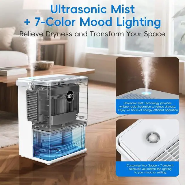 - : Set the 12-hour timer for energy-efficient operation and wake up to a perfectly balanced room. Enhance ambiance with 7-color LED mood lightingchoose soothing hues for relaxation or vibrant tones for a lively atmosphere. Compact and portable, it fits seamlessly in closets, RVs, or bathrooms, doubling as a decorative accent