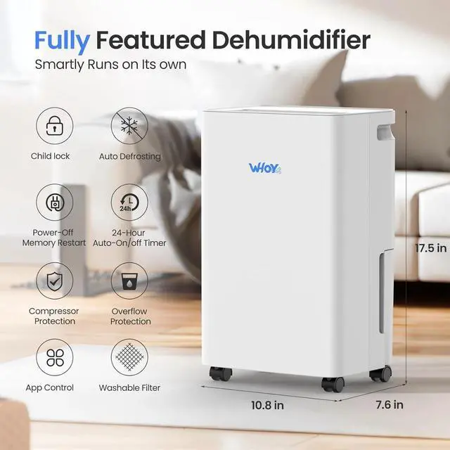- Max Efficient 50 Pints Dehumidification: Effortlessly removes up to max 30 pints of moisture daily(86, 80% RH); 50 pints/day in the humid Mid-summer(95, 95% RH), transforming spaces up to 2000 Sq. Ft.. into healthier, more comfortable areas--perfect for living rooms, bedrooms, and offices.