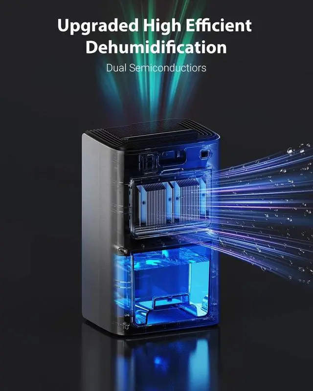 Experience a significant upgrade in moisture control with the UBBO Dual Semiconductor Condenser Dehumidifier. Designed to efficiently extract up to 1.2 liters of excess moisture per day, this compact device is perfect for maintaining ideal humidity levels in small spaces like bathrooms, kitchens, closets, and RVs. Its advanced dual semiconductor condensers provide nearly twice the efficiency of traditional models, making it a practical solution for creating a healthier, more comfortable environment. This dehumidifier is easy to operate and highly practical. Simply place it in your desired space, and it will start effectively reducing humidity while operating at a whisper-quiet 35 dB in sleep modeideal for bedrooms or quiet areas. Features like auto shut-off and overflow protection ensure safe and hassle-free use; the unit automatically stops when the water tank is full and alerts you with indicator lights and audible signals, or you can connect the included drain hose for continuous drainage. Adjustable timer functions allow you to customize operation times for up to 24 hours, fitting seamlessly into your daily routine. Plus, the ambient lighting feature adds a soft, colorful night glow that you can turn off or lock for a cozy and relaxing atmosphere. Beyond moisture removal, this dehumidifier enhances air quality with an integrated aromatherapy box, providing naturally scented, fresh air to invigorate your space. Ideal for home, office, or travel use, it combines efficiency, safety, and comfort in a sleek, space-saving designmaking it a versatile addition for improving your living environment.
