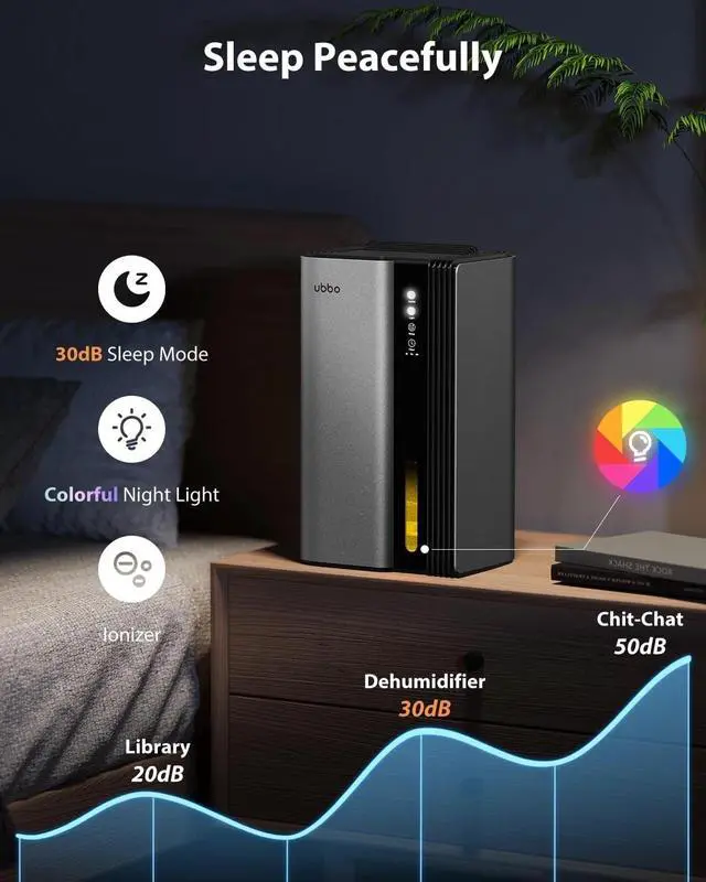 Experience a significant upgrade in moisture control with the UBBO Dual Semiconductor Condenser Dehumidifier. Designed to efficiently extract up to 1.2 liters of excess moisture per day, this compact device is perfect for maintaining ideal humidity levels in small spaces like bathrooms, kitchens, closets, and RVs. Its advanced dual semiconductor condensers provide nearly twice the efficiency of traditional models, making it a practical solution for creating a healthier, more comfortable environment. This dehumidifier is easy to operate and highly practical. Simply place it in your desired space, and it will start effectively reducing humidity while operating at a whisper-quiet 35 dB in sleep modeideal for bedrooms or quiet areas. Features like auto shut-off and overflow protection ensure safe and hassle-free use; the unit automatically stops when the water tank is full and alerts you with indicator lights and audible signals, or you can connect the included drain hose for continuous drainage. Adjustable timer functions allow you to customize operation times for up to 24 hours, fitting seamlessly into your daily routine. Plus, the ambient lighting feature adds a soft, colorful night glow that you can turn off or lock for a cozy and relaxing atmosphere. Beyond moisture removal, this dehumidifier enhances air quality with an integrated aromatherapy box, providing naturally scented, fresh air to invigorate your space. Ideal for home, office, or travel use, it combines efficiency, safety, and comfort in a sleek, space-saving designmaking it a versatile addition for improving your living environment.