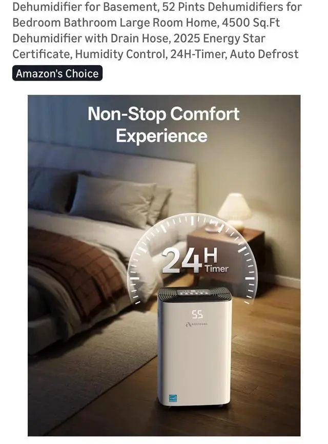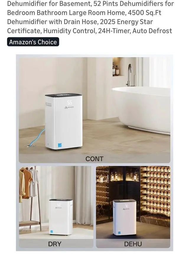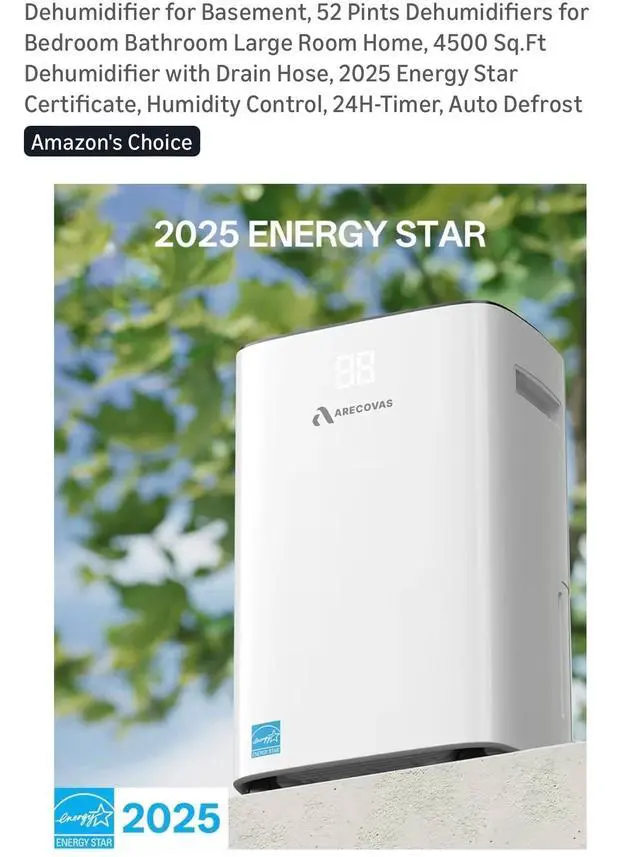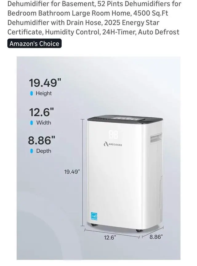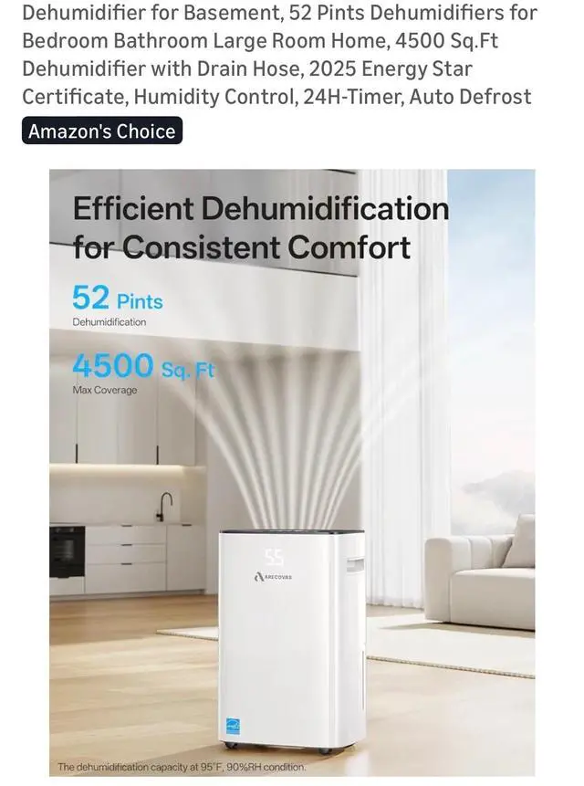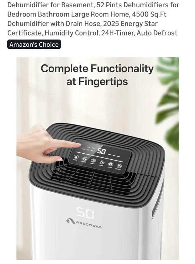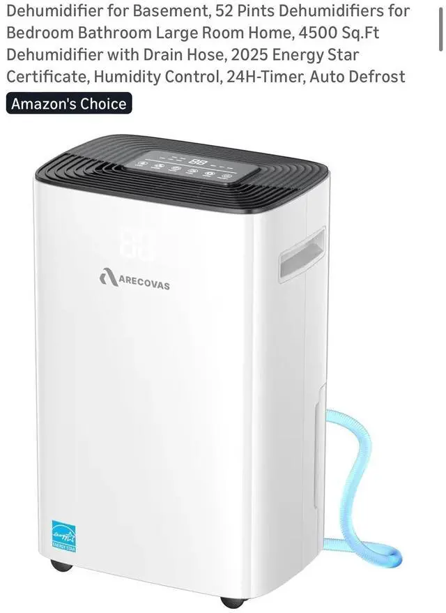 The Dehumidifier for Basement by Arecovas is a 52 pint dehumidifier designed for large rooms like basements, bathrooms, or bedrooms. It features a 24-hour timer control and operates on battery power. Made of plastic and in a sleek white color, this dehumidifier offers two speeds and has a coverage area of more than 215 sq ft, making it ideal for whole house application. With smart home compatibility and a touch control style, this dehumidifier from 2025 is a reliable option for maintaining indoor air quality in your home.