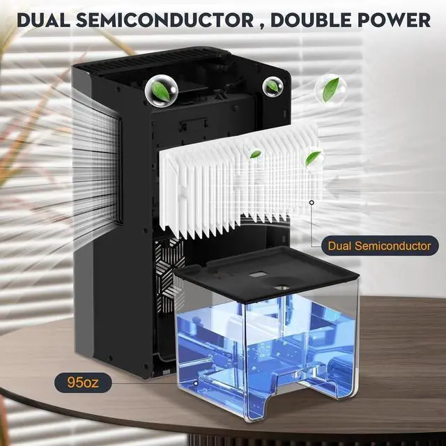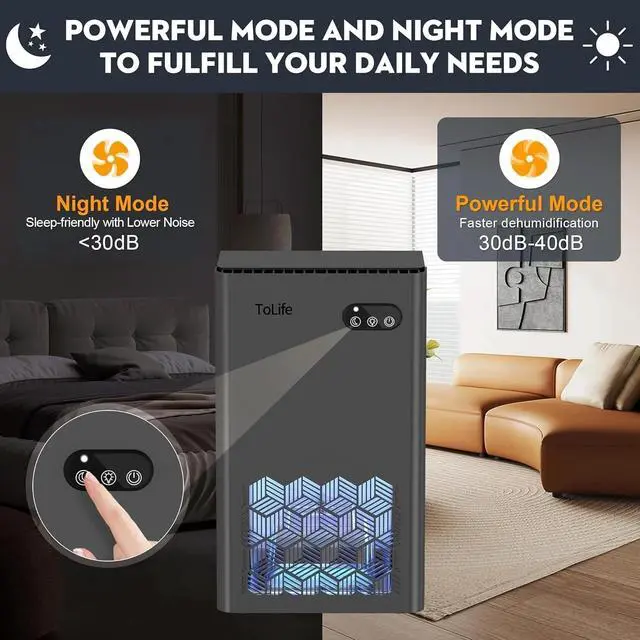 • Two dehumidifier modes: powerful mode for quick moisture elimination and low-speed sleep mode (< 30 dB) for quiet operation.