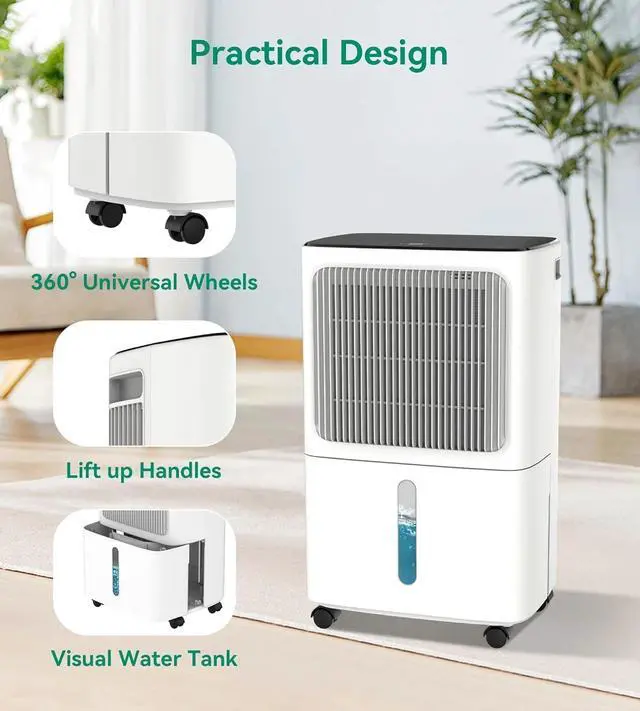 Easy To Move & Modern Design - With its handle and wheels, this dehumidifiers for large room allows you to easily move it around your house to suit the dehumidification requirements of various areas. Additionally, because of its sleek modern form, it can easily fit into any decor and effortlessly match the furniture you already have. Savor the advantages of having a fashionable and very effective dehumidifier in your home