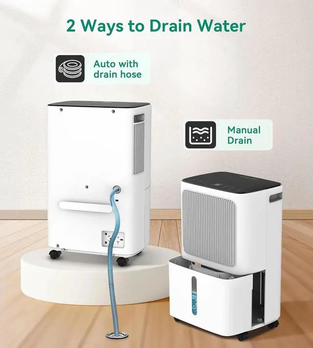 Two Drainage Options - With two drainage options, you can maintain a dry and comfortable room by selecting the drainage option that best suits your needs. When the water tank is full, our deshumidificador will automatically stop under the manual drainage option, and an indicator light will turn on to remind you to empty the tank. Alternatively, you can drain the gathered water continuously without ever having to empty the bucket by using the drainage hose that is included with the automated drainage option