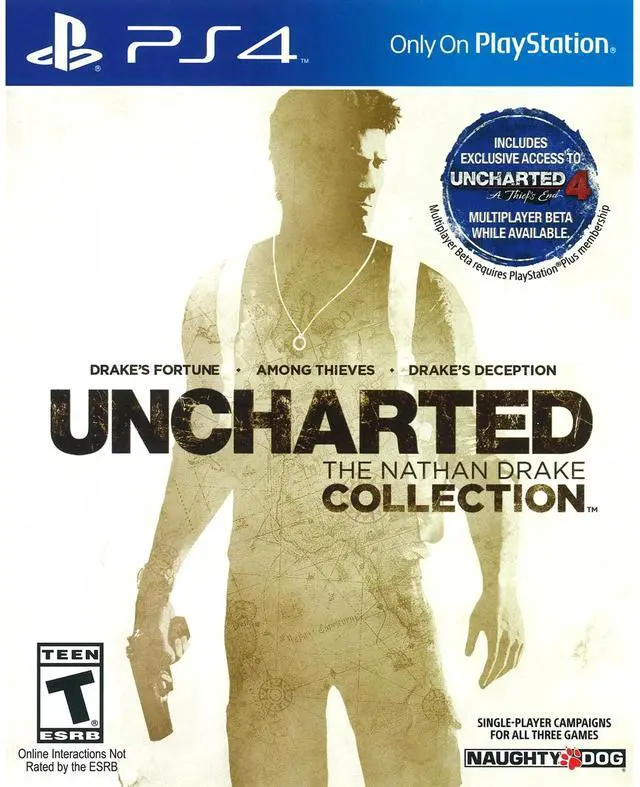 Unparalleled Story Play as Nathan Drake across a trilogy of thrilling, white-knuckle adventures. Experience Drake's relationships with those closest to him, as he struggles to balance adventure and family. New Trophies Brand-new trophies created exclusively for Uncharted's debut on the PS4 system. Photo Mode Freeze gameplay at any time and take control of the camera to capture your most memorable moments from the trilogy to share with friends directly from your PS4 system. Utilize graphical filters, camera controls, and other options to customize your shot. Uncharted 4: A Thief's End Multiplayer Beta purchasers of Uncharted: The Nathan Drake Collection will receive exclusive access to Uncharted 4: A Thief's End multiplayer Beta while the Beta is available. Pre-order Uncharted: The Nathan Drake Collection and receive early access to The Nathan Drake Pack at launch which includes: Uncharted Drake's Fortune Drake skin, Uncharted 2: Among Thieves Drake Skin, Uncharted 3: Drake's Deception Drake Skin, Wetsuit Drake Skin, Nepal Drake Skin, Golden AK-47, Golden 92 FS.