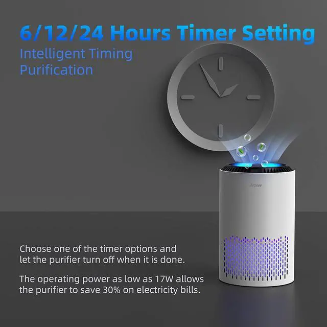 Efficient Particle Filtration: The AROEVE air purifier utilizes a HEPA filter that can effectively filter out particles such as smoke, pollen, dander, hair, and more, potentially improving air quality and promoting better health and well-being for you.